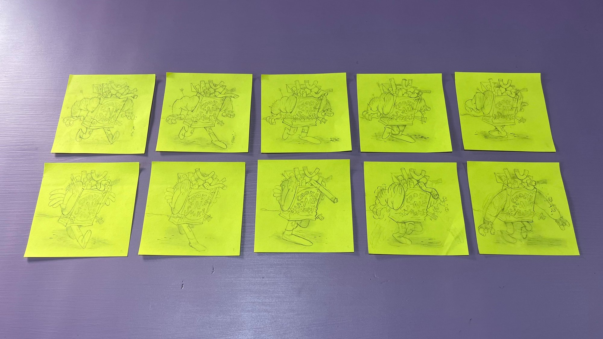 Depiction of the "Coffin Nail" character by Craig Gleason, from Season of the Bad Guys Club Eight (2023). Pencil and Sticky Notes. Ten Pages.