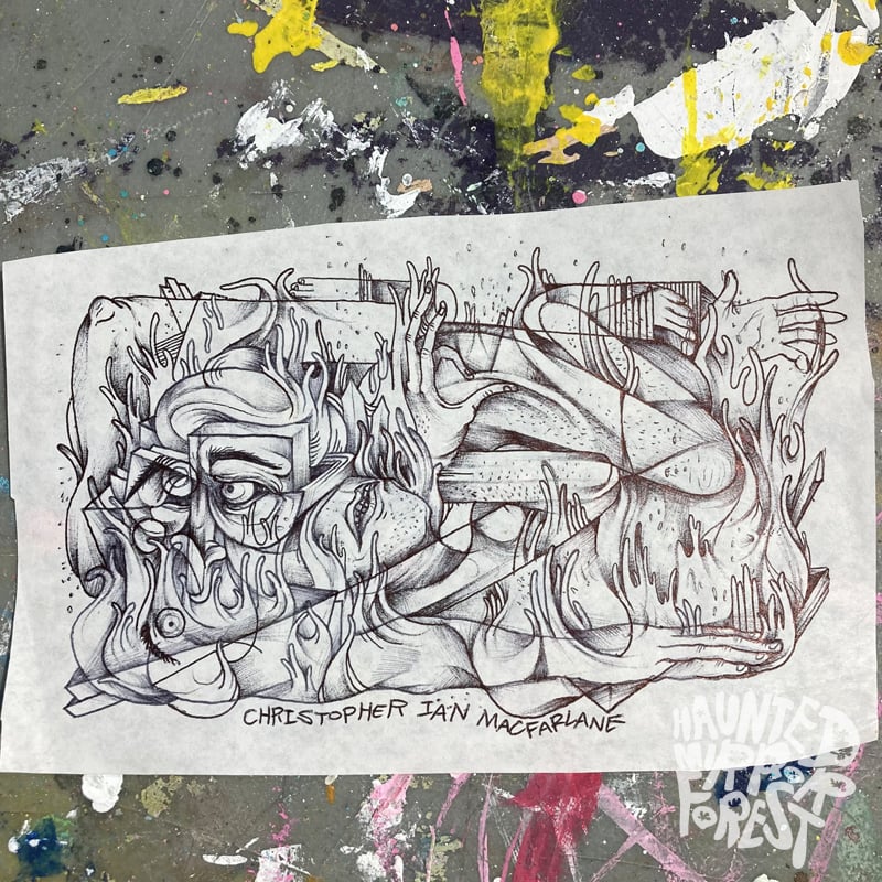 Doodle depicting someone mingled with flames. It is approximately 6 5/8" x 4 1/2" and was drawn in 2016 with a ballpoint pen on computer paper. It is a 1/1.