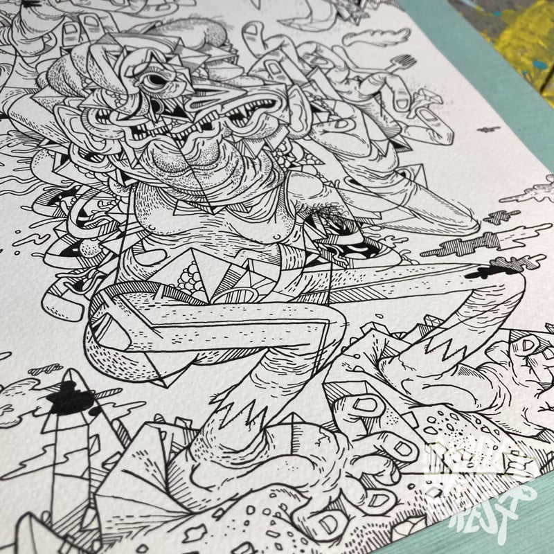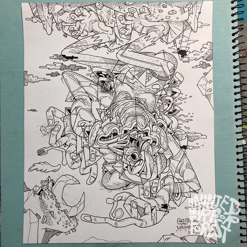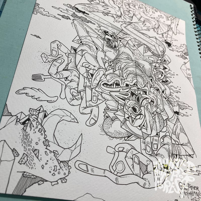 This drawing depicts a person hanging upside-down, gazing at a moon-shaped stone. It was drawn with Micron pens on an 8" x 10" sheet of 90 lb watercolor paper.